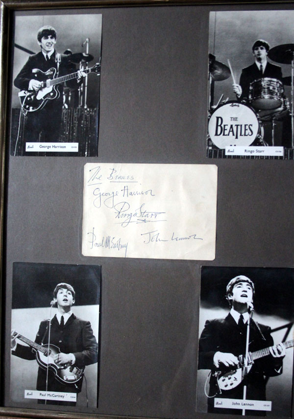 WHAT'S THE STORY GUV' ? When I was 11 or 12 years old I played with a neighbour John Beeston. His mum Margaret was a waitress at the Palace Court Hotel next door (adjacent to the Gaumont) . Cinema) Margaret happened to serve the fabs breakfast one morning and plucked up courage to ask for their autographs for John's sister Jane. Fortuitously Jane was a Rolling Stones fan and was persuaded to sell me the artefact for 12s 6d (my entire pocket money for that week). (ABOVE) Here they are displayed with pride alongside my complete collection of pictures that were given away free with Findus Fish Fingers ! ...Tell that to the kids today .....