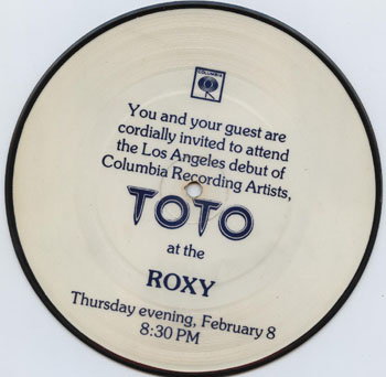 | WHAT'S THE STORY GUV ' ? ~ In 1978 I travelled to America with John Butcher (Singer in my band Bordello) to tout tapes of the band around the L.A. record company offices. Unbelievably in those days you could literally walk in off the street unannounced and an A&R guy would actually sit down and take a listen. A drummer called Mike Owen who was lodging with me at home had a brother called Barry and he was drum roadie for the Average White Band based in L.A. at the height of their 'Pick Up The Pieces' fame. Barry's wife worked in the box office of the 'Roxy' theatre on Sunset Strip and she kindly gave us free passes to the club for the duration of our stay. She ALSO kindly gave me the above picture disc which had been the 'invitation' to watch the L.A. debut of an unknown band called Toto a few months earlier to mark the launch of their first hit 'Hold the Line'. Little did I know that 7 years later I'd spend 6 weeks on the road with my all time favourite band as they promoted their 5th studio album 'Isolation' across the Southern states of America. Even stranger is that in 1985 I returned to the Roxy to help out at a video shoot that John Parr shote there for one of his album tracks called 'Love Grammar' at .. Yup, you guessed it the Roxy . Funny old world innit ? | |